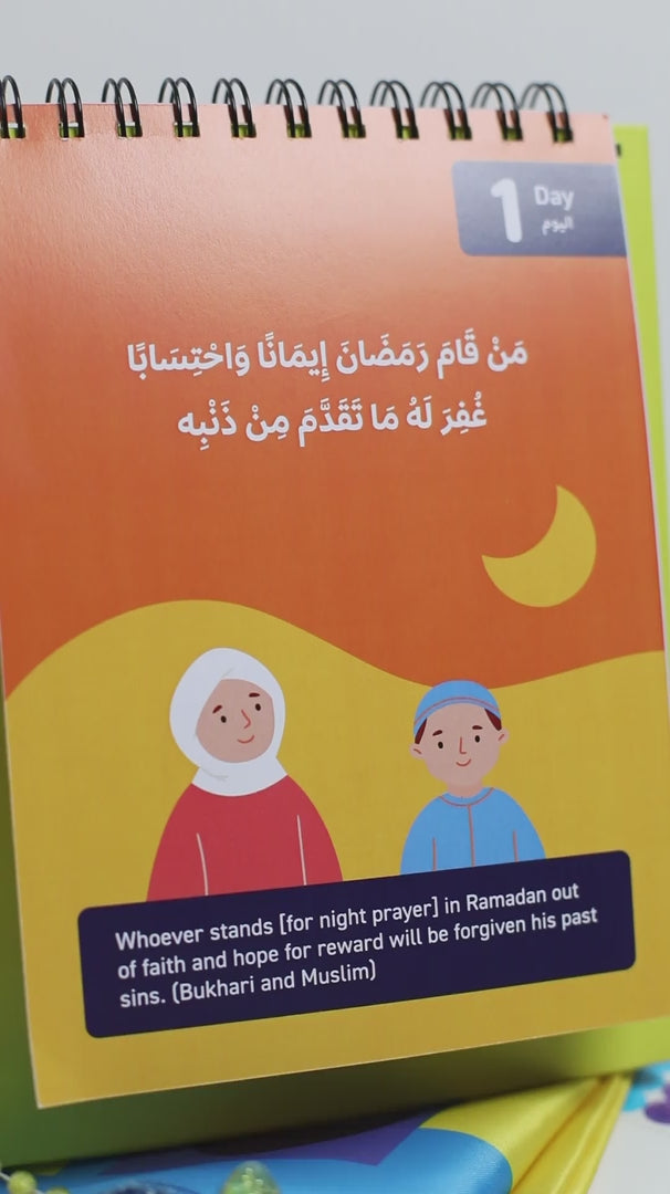 This planner features daily, fun, and colorful illustrated Hadiths that are kid-friendly and easy to relate to. With vibrant colors and engaging designs, it also includes a tracker for prayers and good deeds like fasting and sadaqah. Each day is paired with a "Tip of the Day" to inspire young hearts, and the planner comes with a playful sticker sheet for extra motivation and fun!